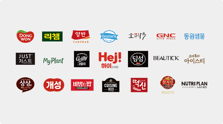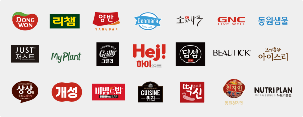 1982년 참치캔 사업을 시작으로, 김치·조미김·냉동HMR·육가공·유가공 제품, 건강기능식품, 펫푸드까지 사업 영역을 넓혀왔습니다. ‘동원’, ‘리챔’, ‘양반’, ‘그릴리’, ‘덴마크’, ‘Hej’ 등 국내외 인기 브랜드를 보유하며, 소비자에게 친근하고 믿을 수 있는 선택지를 제공합니다.