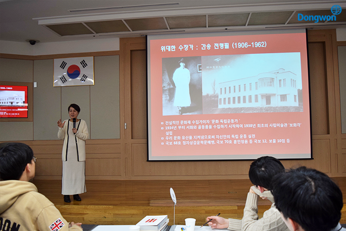 윤여순 예술자문위원은 “예술을 가까이 하라”는 조언을 시작으로 이 수업을 하나의 예술처럼 편안히 듣고 느끼고 즐기길 당부했습니다. 예술이 마냥 어려운 것인지, 예술이란 무엇인지, 특별한 사람들만이 누리는 사치인지, 우리 주변에 예술은 어떻게 존재하고 있으며 우리는 그것을 얼마나 느끼고 향유하고 있는지에 대한 설명이 이어졌는데요. 이를 통해 학생들은 예술을 보다 가깝게 느끼게 되었습니다.