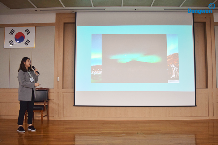 3분 스피치를 마치고 이서영 학생이 ‘동료수업’을 진행했습니다. 동료수업은 학생이 학생들에게 자신이 알고 있는 지식을 이해하기 쉽고 재미있게 설명하는 시간인데요. 이날 이서영 학생은 자신의 아이슬란드 여행기를 바탕으로 오로라가 보이는 이유, 아이슬란드 간헐천의 작용 원리 등 지구 과학에 대한 지식을 학생들에게 잘 가르쳐줬습니다. 딱딱하고 어렵기만 한 과학 지식이 아니라 신비롭고 재미있는 오로라 이야기를 다뤄 학생들은 시간 가는 줄 모르고 수업을 들었습니다.