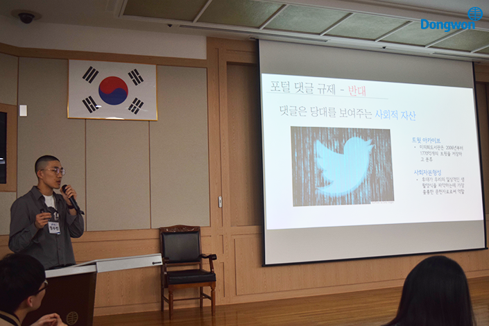학생들의 진행으로 이어지는 ‘우리들의 시선으로 세상을 바라보다’ 시간에서는 4조 학생들이 발제한 사회적 이슈를 토론하는 방식으로 진행됐습니다. 이번 이슈는 ‘인터넷 포털 사이트 댓글 규제’였는데요. 최근 쟁점이 되는 댓글 조작 문제를 화두로, 포털 사이트 댓글을 규제해야 하는지에 대한 학생들의 열띤 토론이 이어졌습니다.