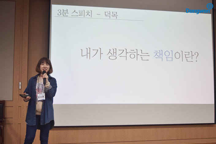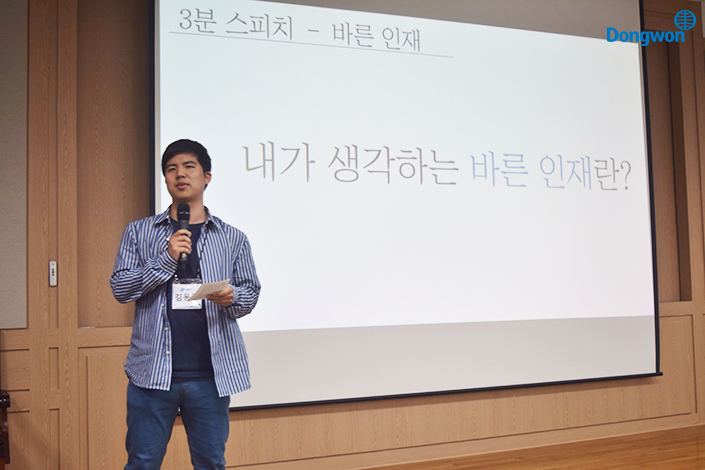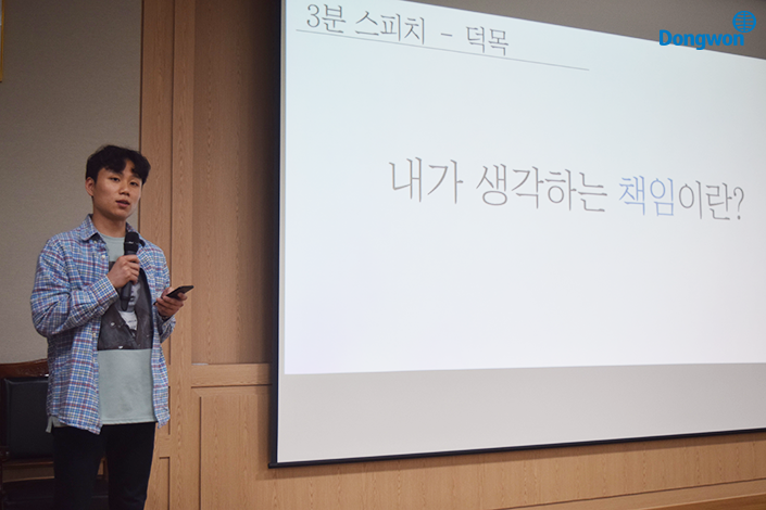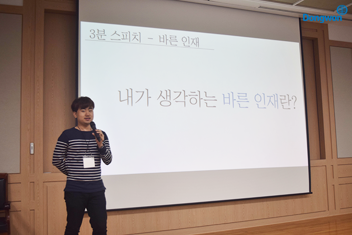 김용길 학생은 3분 스피치에서 “바른 인재는 자신에게 맡겨진 소임을 다하는 사람으로 실력과 인성을 겸비한 사람”이라며 “인성을 기르기 위해서는 경청하는 자세가 필요하다”라고 이야기했습니다.