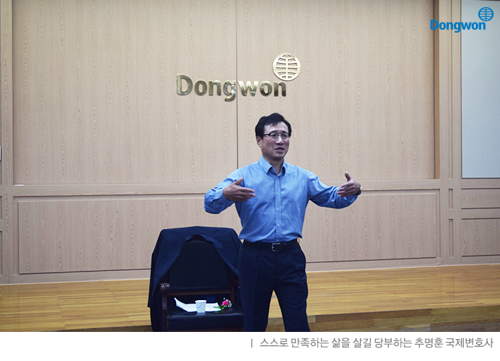 추명훈 국제변호사는 학생들을 향해 여러 방면에서 자신을 발전시킬 것을 강조했습니다. 그는 “현재 미국에서는 한 사람이 죽을 때까지 갖는 직업의 수가 평균 11개”라고 말하며 “현재 종사하는 분야에 깊이 몰두하면서도, 여러 방면에 관심을 기울이고 도전하면서 자신을 발전시키는 자세가 중요하다”고 조언했습니다. 마지막으로 그는 ‘앞으로 인생을 어떻게 살아갈 것인가?’라는 질문에 대해 “죽음을 앞에 두었을 때 삶에 대하여 스스로 만족할 수 있는 삶이 되기를 바란다”고 당부했습니다.