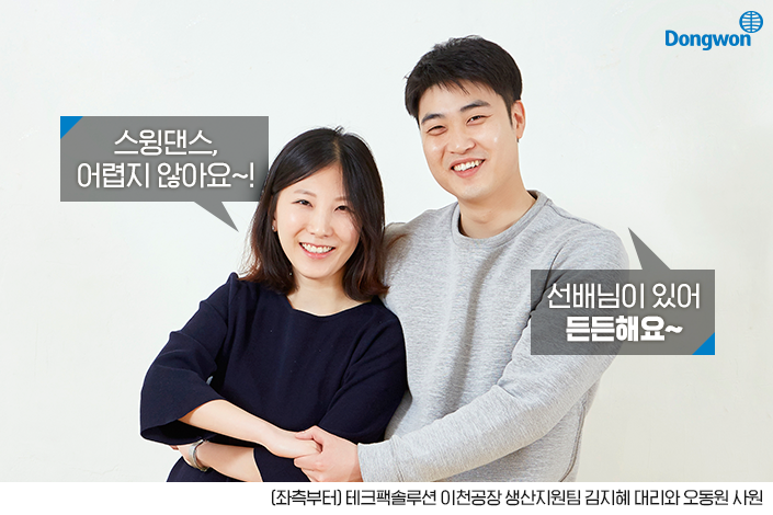 “몸치여서 걱정을 많이 하고 스텝이 어려워 질수록 난항을 겪어 파트너들에게도 미안했는데 김지혜대리님이 친절하게 알려주셔서 많이 배웠어요. 앞으로도 선배님께 많이 의지하면서 멋진 동원인으로 성장하고 싶습니다”