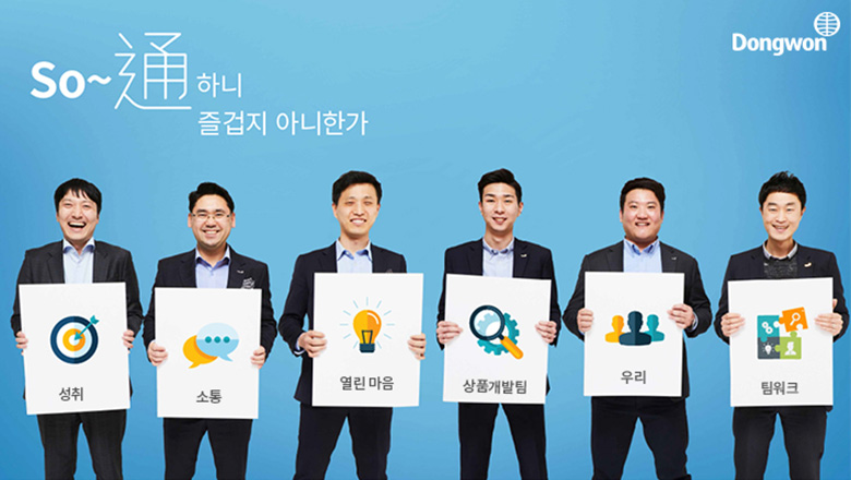 남자들만 모여 있는 팀이라고 한다면 군기 가득한 군대문화가 떠오르기 마련인데요. 팀원 모두가 똘똘 뭉쳐 소통의 힘으로 즐겁게 일하는 팀이 있습니다. 바로 동원홈푸드 금천사업부 상품개발팀이에요. 6명의 남자로 이루어진 이 팀이 즐겁게 일할 수 있는 원동력은 무엇일까요? 그들의 비결을 지금 공개합니다!