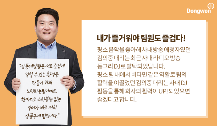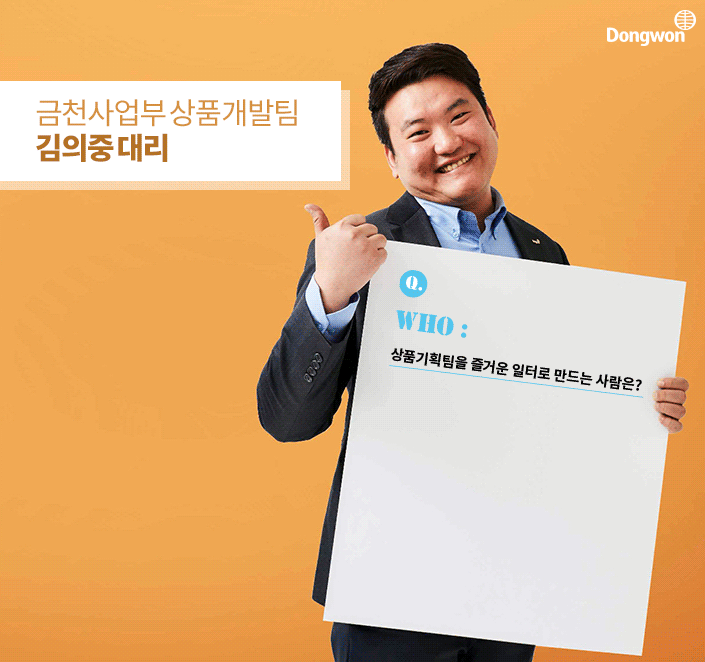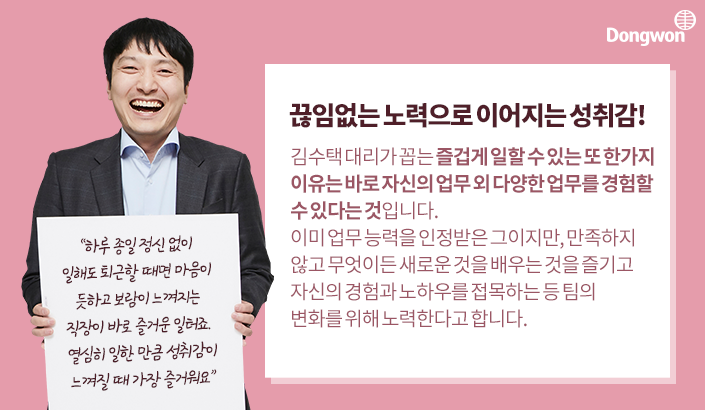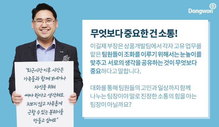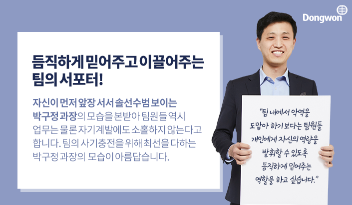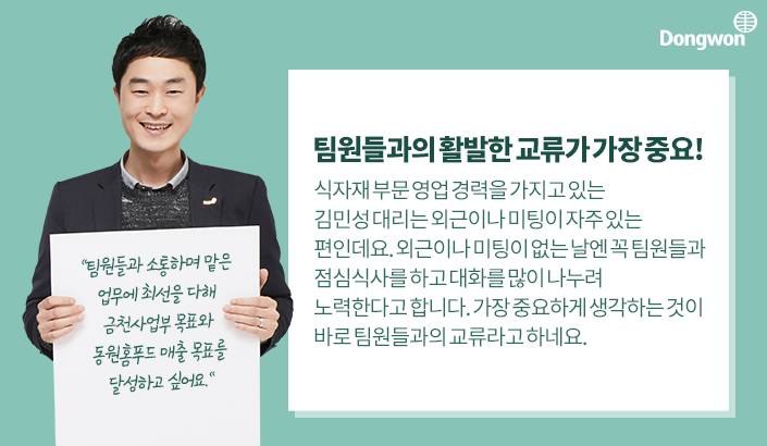 이창우 사원의 말처럼 직장에서 어려움을 겪을 때 대부분 일 보다는 사람 때문인 것 같은데요. 그래서인지 금천사업부 상품개발팀의 팀워크는 매우 남다른 듯 보입니다. 팀원으로써, 형 동생으로써도 배려가 넘치고 서로 의지하는 금천사업부 상품개발팀! 앞으로 좋은 팀워크를 지속적으로 보여 줘 동원그룹 내에서도, 밖에서도 최고의 팀으로 성장하길 바랍니다.