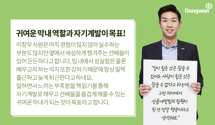 상품개발팀의 막내 사원인 이창우 사원은 팀에 들어온 후 크게 감동한 사건이 있었다고 해요. 동원홈푸드 인턴사원으로 입사했을 당시 학교 졸업식에 참석을 못했었는데 그런 이창우 사원을 위해 팀원들이 졸업식에 화환을 보내주었다고 합니다. 이를 몰랐던 이창우 사원은 졸업식 이후 친구들을 만나기 위해 학교를 찾았을 때 자신의 이름이 쓰인 화환을 보고 깜짝 놀랐다고 하네요. 팀 내에서 애교 없이 무뚝뚝한 막내이지만 선배들은 배려와 사랑을 아끼지 않는답니다.